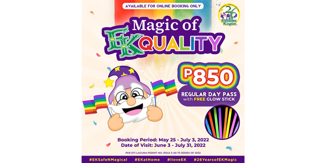 Enjoy endless memories with our Magic of EKquality promo. Get one Regular Day Pass for only P850 bundled with a FREE glow stick. Book your tickets until July 3 and enjoy your visit from June 3 – July 31, 2022 at the EK Online Store https://shop.enchantedkingdom.ph/.