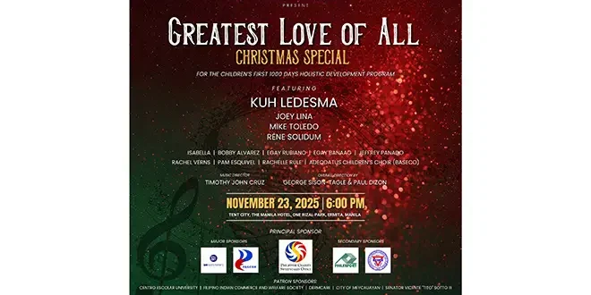 In partnership with The Manila Hotel, the Children’s First 1000 Days Coalition (CFDC) presents “Greatest Love of All: Christmas Special”, a grand evening of music and purpose happening on November 23, 2025 at 6:00 pm at Tent City, The Manila Hotel.