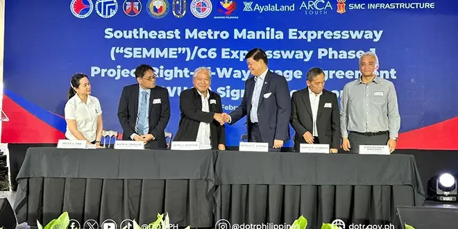 The Department of Transportation (DOTr), Department of National Defense (DND), Veterans Federation of the Philippines, and Toll Regulatory Board (TRB) have signed on Monday the Right-of-Way Usage Agreement (ROWUA) for the Southeast Metro Manila Expressway (SEMME) or C6 Expressway by San Miguel Corporation (SMC) Skyway Stage 4 Corporation (MMSS4).