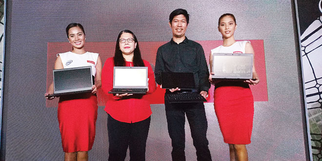 Lenovo Philippines Marketing Manager Anna Abola and Commercial SMB 4P Manager Francis Judan (second and third from left, respectively) join two Lenovo models in holding the newest 7th Generation Kaby Lake-powered additions to the company’s ThinkPad line of laptops during their launch at the Discovery Primea hotel in Makati City on March 15. ALVIN I. DACANAY