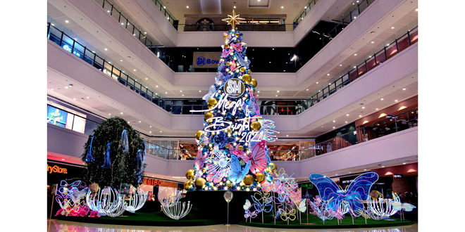 All is mega and bright as SM Megamall welcomes Christmas with a 45-foot tree adorned with thousands of Christmas lights, teal blue and gold ornaments, and oversized acrylic butterflies in yellow, teal blue, and pink neon gel flex lights.
