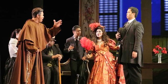 The libretto as attributed to two National Artists, Guillermo Tolentino in Sculpture and Felipe Padilla de Leon in Music, is indeed ingenious even if there is the living source of a novel—“Noli Me Tangere” by Dr. Jose P. Rizal. The way the whole story is woven into an exact, solid stage version is innovative and daring in its Filipino richness in language and its English translation easily identified in a projected atop the curtain. Obviously, non-verbatim elaboration of the dialogues, they are easily understood even by a non-Filipino speaker.