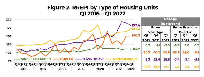 In Q1 2022, the 5.6 percent YoY growth in the nationwide RREPI was mainly driven by the rise in the prices of townhouses, duplex housing units, and condominium units, increasing by 25.6 percent, 20.9 percent, and 14.7 percent, respectively. Conversely, prices of single-detached/attached houses contracted by 2.5 percent (Figure 2).