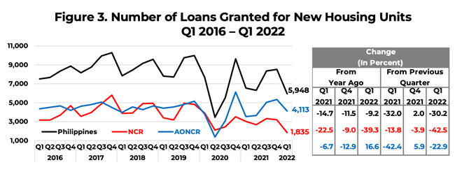 In Q1 2022, the number of residential real estate loans (RRELs) granted for all types of new housing units in the Philippines contracted by 9.2 percent YoY due mainly to the 39.3 percent decrease in the number of NCR RRELs.
