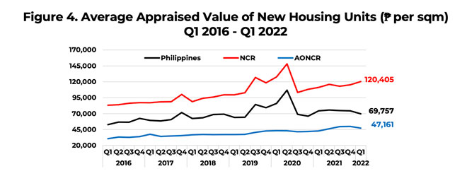 The average appraised value of new housing units in the country stood at Php69,757 per square meter (sqm) in Q1 2022.[3]  The average appraised value per sqm was higher in the NCR (at Php 120,405) than both the national and AONCR average (at Php47,161) (Figure 4).