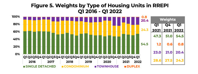 The weight of each type of housing unit in the RREPI is determined by dividing the total floor area (in sqm) of a specific type of housing unit over the total floor area of all housing types. In Q1 2022, single-detached/attached houses in the RREPI continued to constitute the largest weight at 54.5 percent. Meanwhile, condominium units, townhouses, and duplex housing units accounted for 24.3 percent, 20.4 percent, and 0.8 percent, respectively (Figure 5).
