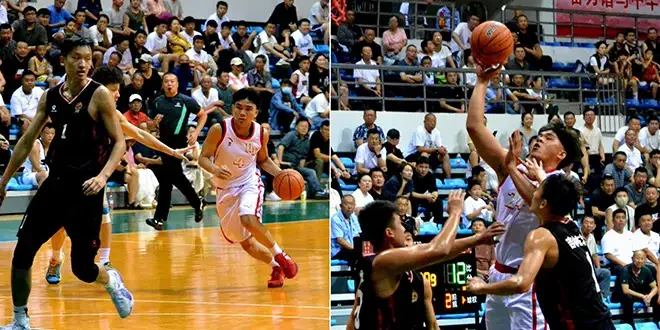 (left) Kristoper Lagat of the UE Red Warriors looks to make a play. (right) Drew Jimenez of the UE Red Warriors battles two Jilin defenders. (Photo by Robert Andaya)